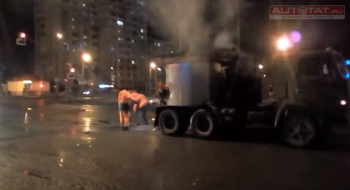 Житель Казани записал видео, как дорожники кладут асфальт в лужу.