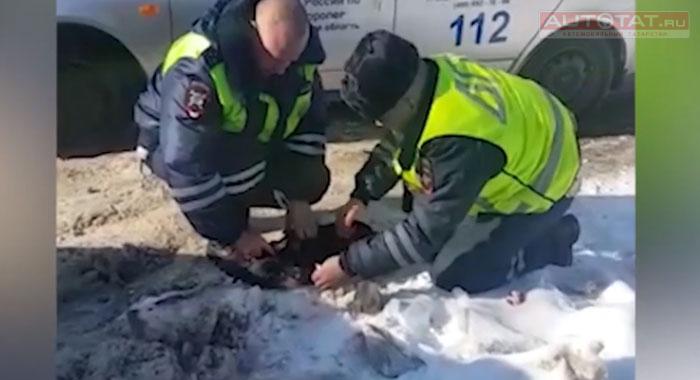 На кадрах записи видно, как инспектор перевязывает кровоточящие раны бинтами из аптечки, а другой держит собаку. После оказания первой помощи, они помогли найти несчастному животному новых хозяев, сообщает источник.