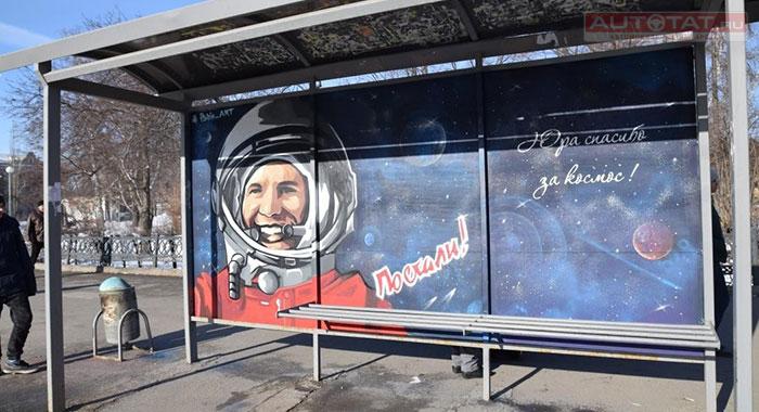 Ко дню Космонавтики на одной из автобусных остановок в Казани появилось граффити с Юрием Гагариным. Правда ее автор допустил досадную ошибку.