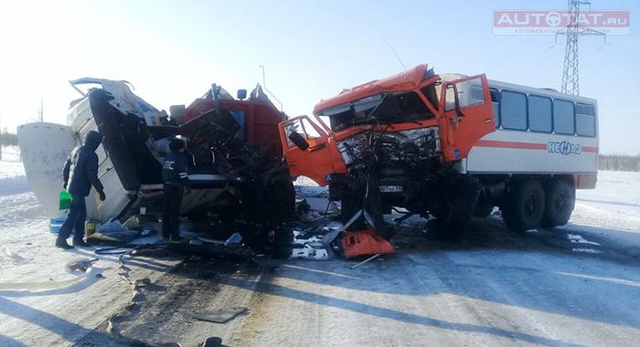 Крупное ДТП произошло на 77-м км автодороги Новый Уренгой-Ямбург. Вахтовики из Татарстана, ехавшие в автобусе, столкнулись с Камазом. Появилось видео с места происшествия.
