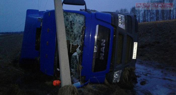 По имеющейся информации, 36-летний водитель грузовика MAN ехал со стороны Чистополя, не выбрал безопасную скорость движения, не смог справится с управлением и опрокинулся в кювет.