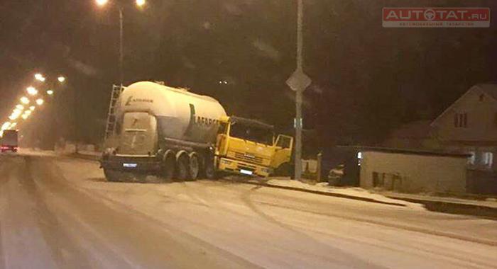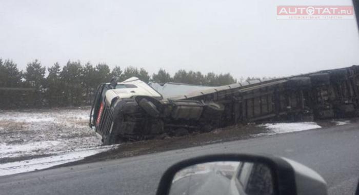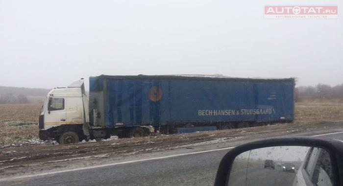 В Татарстане фуры вылетают с трассы из-за гололеда на дороге. ФОТО