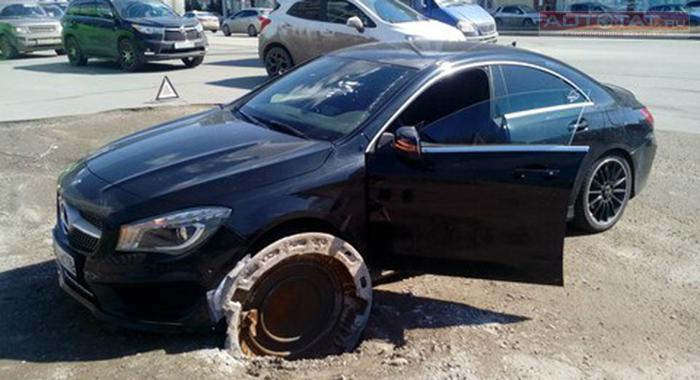 Похоже водитель дорогой иномарки наехал неудачно на технических люк. В результате левое переднее колесо “Мерседеса” провалилось в колодец, а тяжелая металлическая крышка ударила по крылу иномарки.