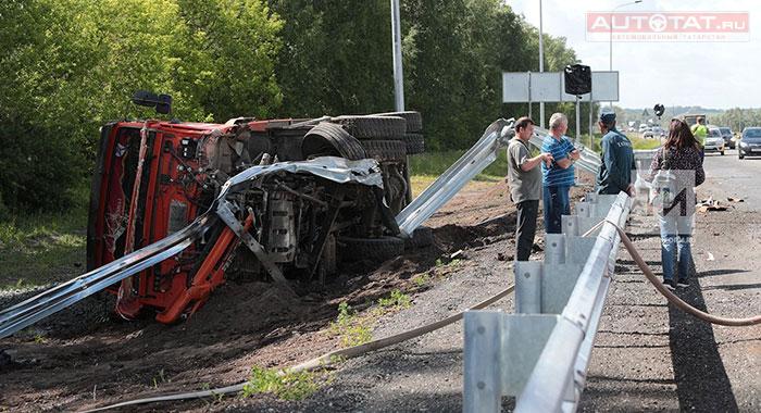 Напомним, что трагедия случилась вчера днем на трассе Казань-Оренбург недалеко от села Бима. В результате столкновения легковушку перевернуло, а грузовик опрокинулся набок, снес дорожное ограждение и улетел в кювет.