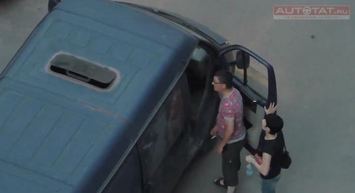 На кадрах записи мобильного телефона видно, как разъяренный мужчина в очках сначала орет на водителя, а затем с ноги закрывает пассажирскую дверь.