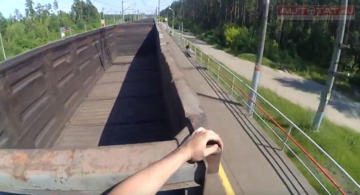 На кадрах видео видно, как ребята сначала сидят в пустом вагоне, а затем на ходу высовываются из него и перемещаются между вагонами.