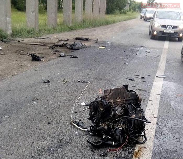 Удар о бетонную конструкцию был такой силы, что у иномарки вырвало двигатель. Различные кузовные повреждения получили также ВАЗ-2114 и Great Wall.