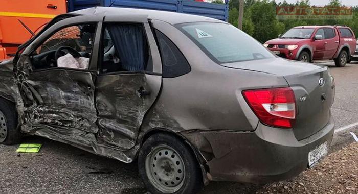А вот Гранту после столкновения развернуло поперек трассы и все двери буквально вмяло в салон. В результате ДТП из этого автомобиля скорую помощь пришлось оказывать 42-летнему водителю и его 68-летней пассажирке.