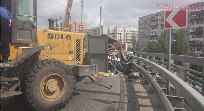 Сегодня утром на развязке в районе ул. Сахарова опрокинулся набок грузовик, перевозивший мусор. Сотрудники ДПС временно перекрыли дорогу, чтобы его поднять.