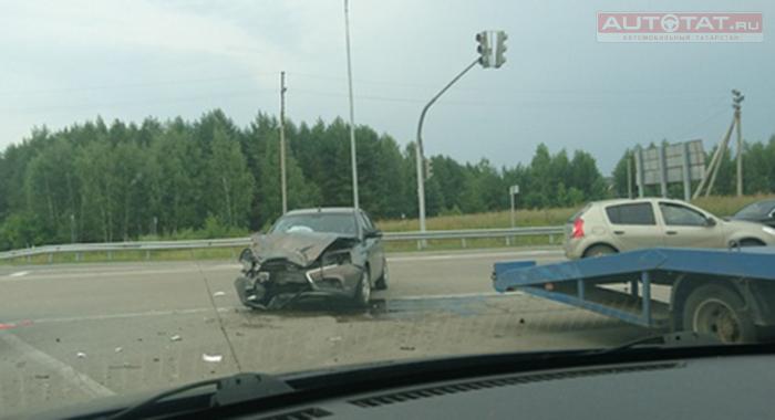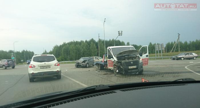 В Лаишевском районе произошло лобовое столкновение иномарки и эвакуатора Газель. Авария случилась недалеко на перекрестке от села Габишево.