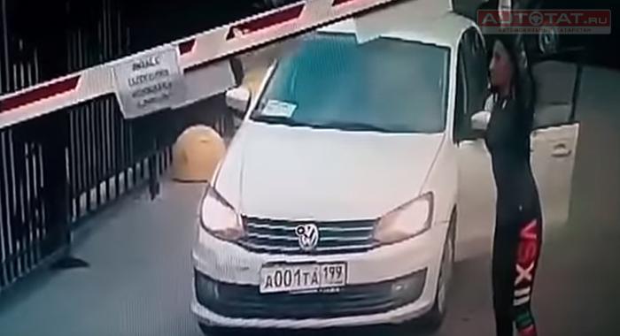 Спортсменка на Volkswagen Polo попыталась выехал с закрытой парковки, но ей путь преградил шлагбаум. Тогда она взяла, да и сломала его. Этот момент попал на камеру наружного наблюдения.