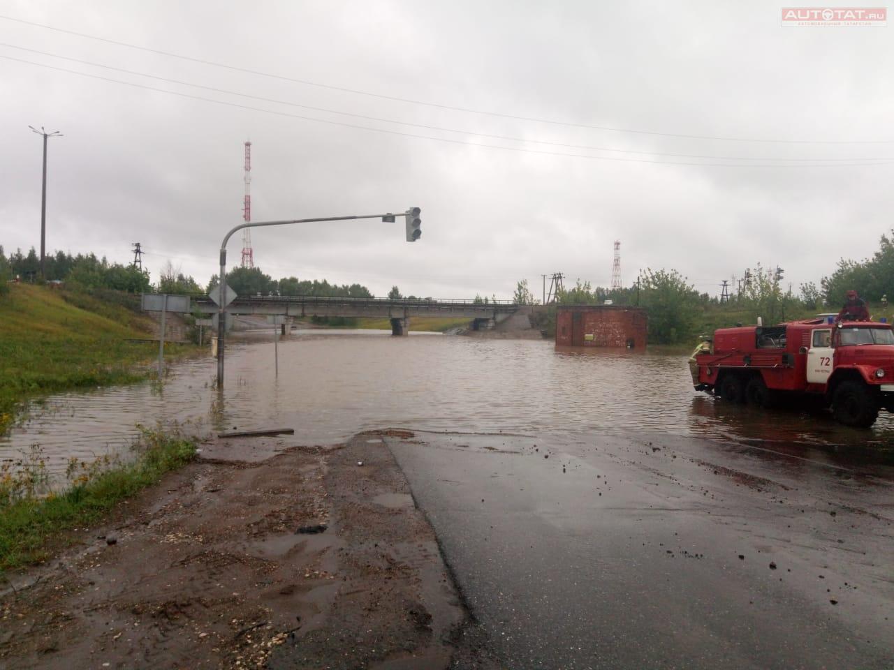 После сильнейшего ливня ночью в Набережных Челнах утонул в луже автомобиль, а промышленную зону города отрезало от города.