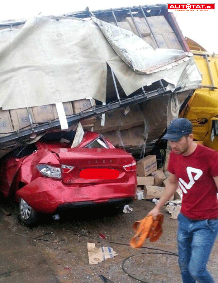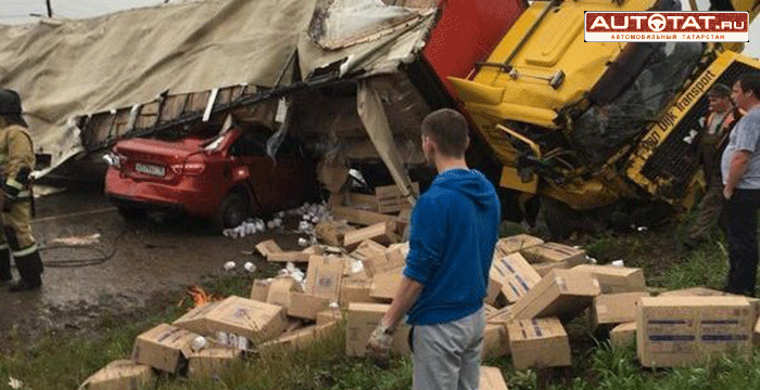 По предвраительной информации, неустановленный автомобиль подрезал грузовик МАН, который вез туалетную бумагу с завода в Набережных Челнах. Водитель фуры потерял управление и опрокинулся на автомобиль «Лада», двигавшийся по встречке.