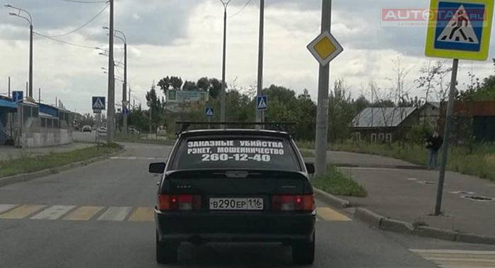 Сотрудники полиции задержали в Казани бизнесмена, на машине которого крупно написано “Заказные убийства, рэкет, мошенничество” и номер телефона.