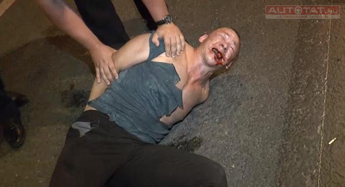 До приезда полицейских кто-то из очевидцев разбил лицо хулигану, однако позже мужчина вырвался, начал бегать по улице и кидаться на машины.