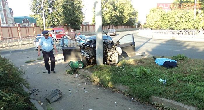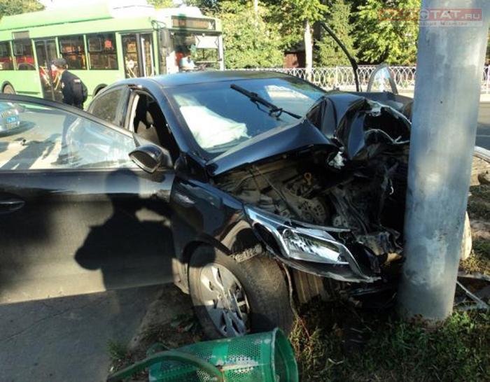 Вчера рано утром в Казани на пустой дороге автомобиль KIA вылетел с дороги на огромной скорости и врезался в столб.