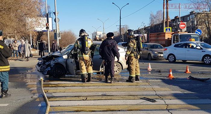 Сегодня в Казани на Кулахметова произошло ДТП с загоревшимся автомобилем. Видео
