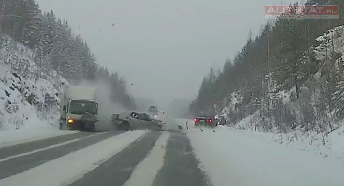 На записи очевидца видно, как легковой автомобиль попадает левыми колесами на снежный накат разделительной полосы, и машину кидает в занос прямо на встречку.