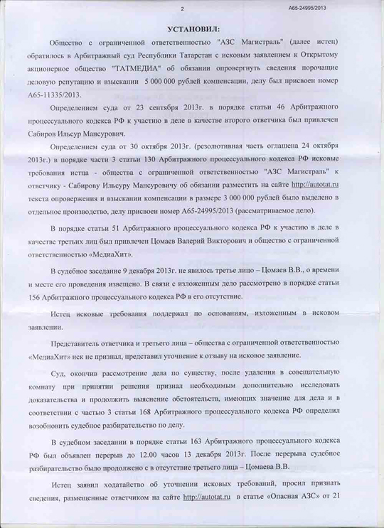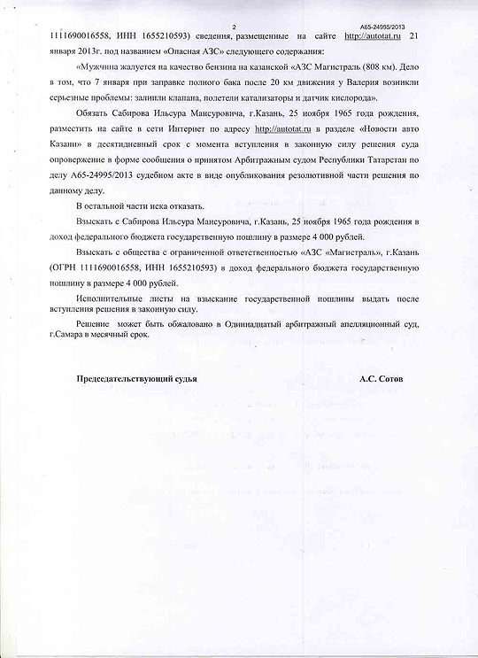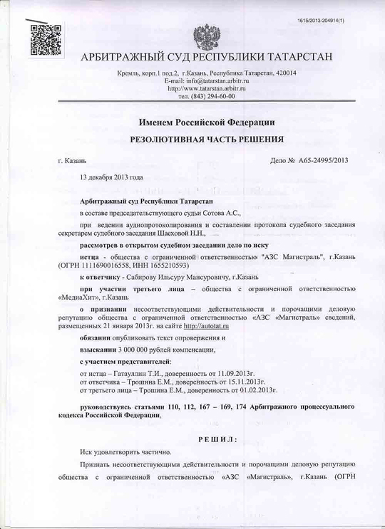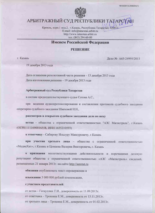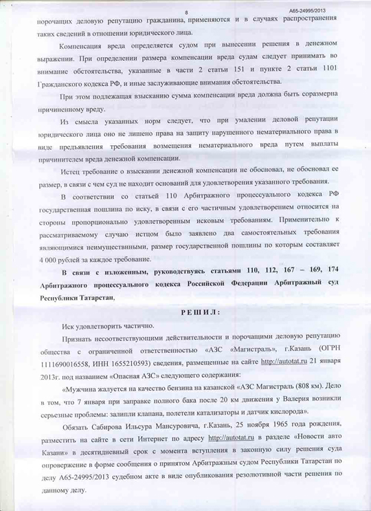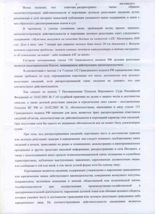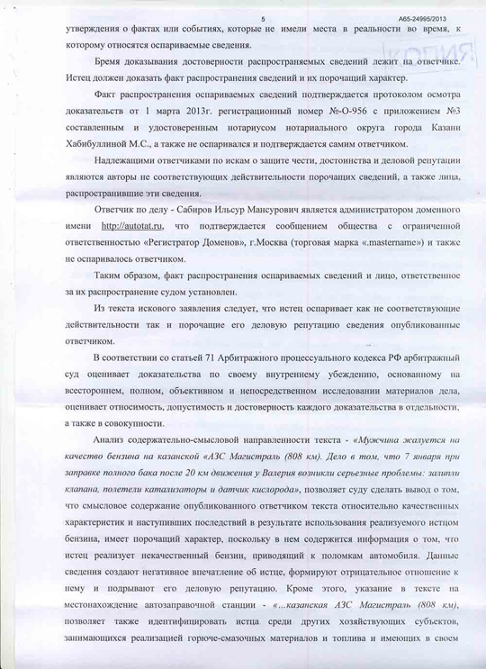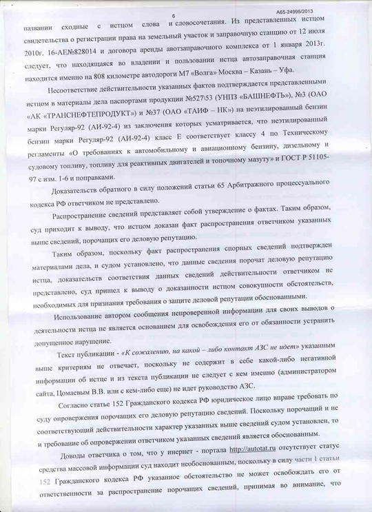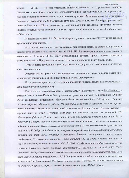 Анализ содержательно-смысловой направленности текста новости "Опасная АЗС", опубликованной на Автопортале AUTOTAT.ru 21.01.2013, Арбитражным Судом Республики Татарстан, показал, что смысловое содержание опубликованного текста относительно качественных характеристик и наступивших последствий в результате использования реализуемого ООО "АЗС Магистраль" бензина, имеет порочащий характер, поскольку в нем содержится информация о том, что ООО "АЗС Магистраль" реализует некачественный бензин, приводящий к поломкам автомобиля.