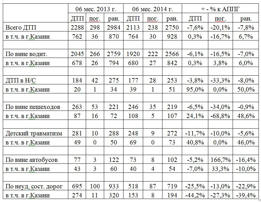 Таблица аварийности в РТ и Казани за 2014 год