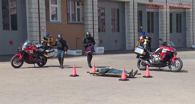 Казанский гарнизон МЧС приступил к патрулированию улиц на пожарных мотоциклах Honda VFR1200X. На дежурство каждый день будут выходить по два мотобайка, выполняющих одновременно функции пожарного, спасателя и медика.