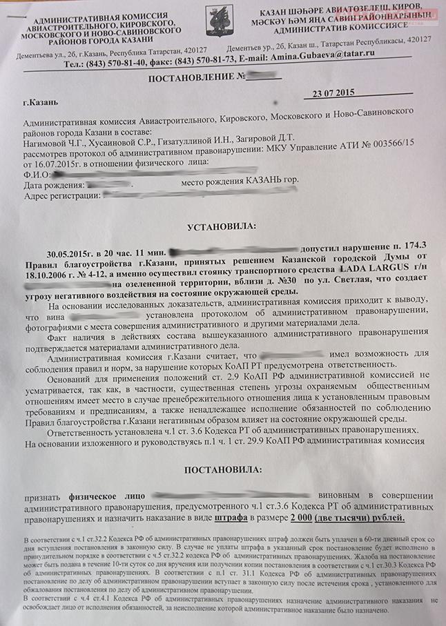 Судя по заключению комиссии, водитель «допустил нарушение п. 174.3 Правил благоустройства Казани», а именно осуществил стоянку ТС на «озелененной территории», что негативно сказалось на состоянии окружающей среды.