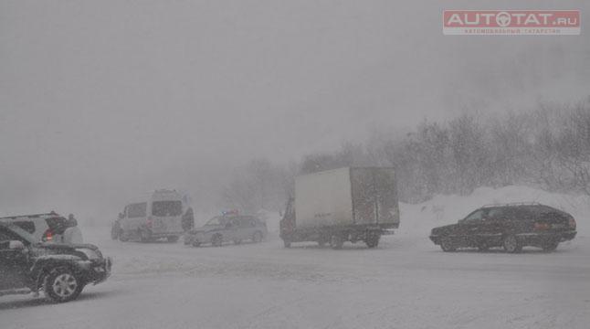 В связи с надвигающейся метелью, водителям рекомендуют воздержаться от дальних поездок, увеличить дистанцию и снизить скоростной режим.