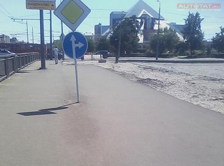 Недалеко от пересечений улиц Левобулачная, Ташаяк и площадь Тысячелетия дорожный знак установлен весьма странным образом. Находится он в 3-х метрах от дороги, на высоте чуть выше1,5 метра. Он неудобен как автомобилистам, так и пешеходам: из машины его не видно, так как, он далеко и его перекрывает забор; помимо этого знак расположен по середине пешеходного тротуара на уровне лица человека, и очевидно, что он мешает проходу людей.