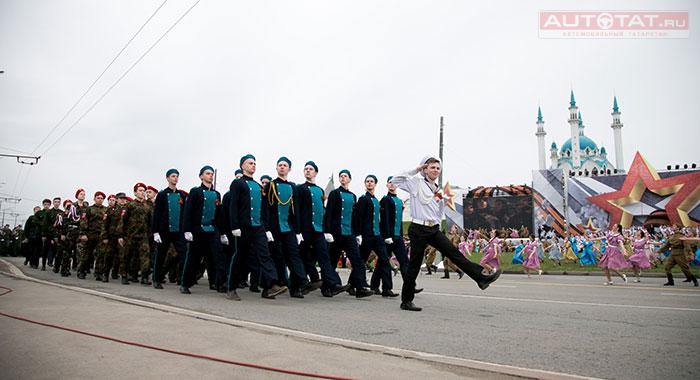 После гимна Татарстана на площади начался торжественный марш войск. В параде приняло участие свыше 1800 человек, 14 единиц техники и 26 парадных расчетов под руководством начальника Казанского гарнизона генерала-майора Кирилла Кулакова.