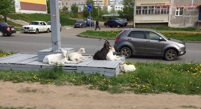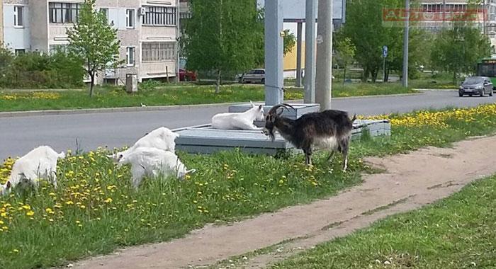 Сегодня с утра водители Казани и не только заметили на улице Закиева козу с козлятами. Домашние животные отдыхали и щипали траву под рекламными щитами, сообщают очевидцы.