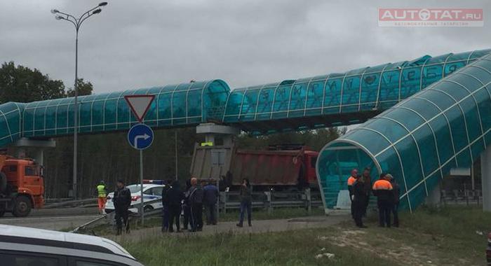 На трассе Казань — Зеленодольск в районе деревни Урняк водитель грузовика снес надземный переход.