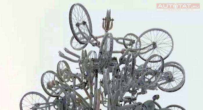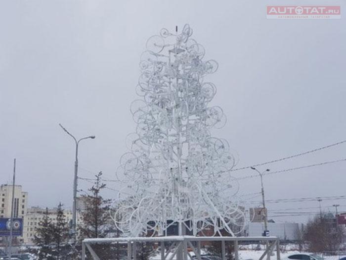 Необычная елка появилась рядом со станцией метро “Козья слобода” в Казани. Ее сделали из велосипедов.