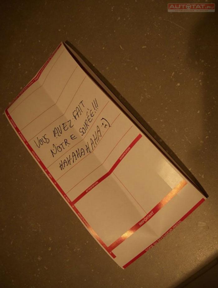 Правда это оказалась не штрафная квитанция, а записка со следующим содержанием: “Вы сделали нашу ночь! Ха-ха-ха :)”.