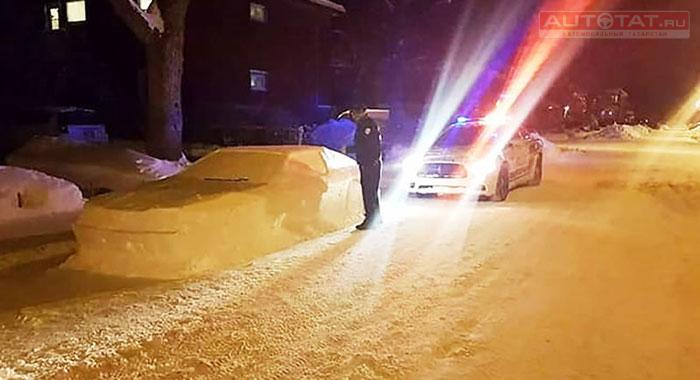 Полицейских озадачи автомобиль из снега, припаркованный с нарушением.