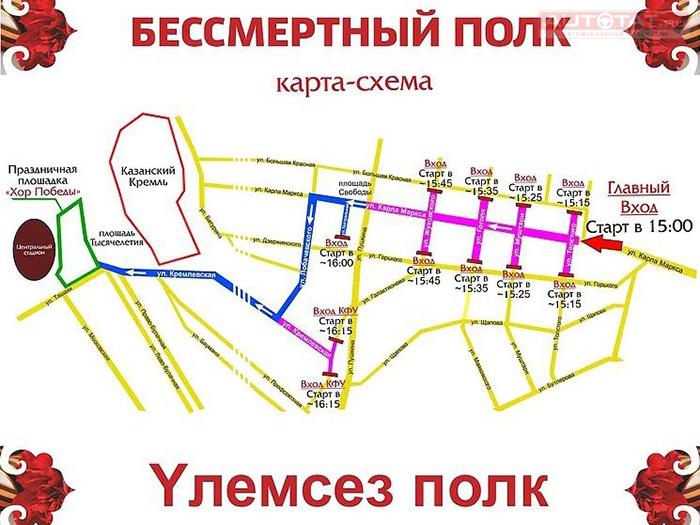 Напомним, что маршрут “Бессмертного полка” пролегает по ул. Карла Маркса через пл. Свободы, Лобачевского и Кремлевская. Завершится он на площади Тысячелетия, где запланирована праздничная программа.