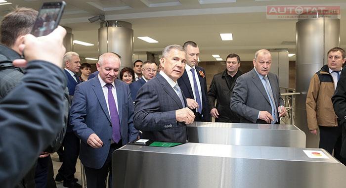 Минниханов осмотрел оформление станции Дубравная, оценил новый способ бесконтактной оплаты проезда с помощью мобильного телефона и прокатился в вагоне до станции Пр. Победы.