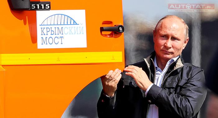 Вопреки многим ожиданиям, Путин проехал по мосту не на новом лимузине, а на простом грузовике КамАЗ оранжевого цвета. Вместе с колонной строительной техники президент проехал несколько километров по новому мосту, а затем вышел к микрофону и произнес благодарственную речь перед строителями.