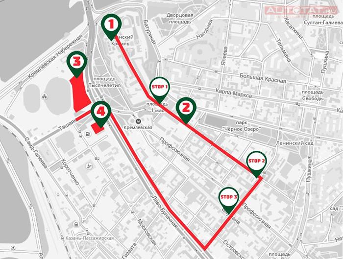 В автобус казанская команда сядет в 19:00 часов на площади 1 Мая после того, как в Кремле проведет встречу с президентом РТ Рустамом Миннихановым. Далее праздничный автобус проследует по маршруту: ул. Кремлевская - ул. Астрономическая - ул. Баумана - ул. Право-Булачная - площадь Тысячелетия.