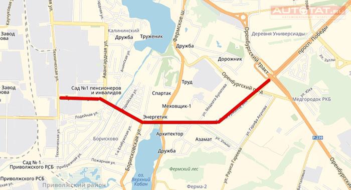Получается, что проектируемый участок должен соединить улицу Техническая с ул. Мидхата Булатова и Баки Урманче. Причем на первом этапе работ планируется построить дорогу от ул. Булатова до ул. Борисковской - до 24 мая 2019 года там появится магистральная улица и трамвайные пути.