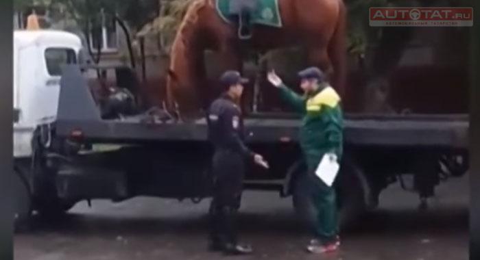 В центре Казани эвакуатор забрал с парковки полицейскую лошадь. Видео