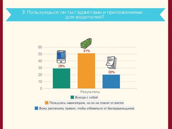 Благодаря опросу удалось выяснить, что 80% россиян за рулем используют навигаторы и видеорегистраторы, однако они практически бесполезны в споре с сотрудниками ДПС, так как последний может «загрузить» неопытного водителя разного рода терминами и воспользоваться незнанием правил дорожного движения. Именно поэтому, 20% из опрошенных возят всегда с собой распечатку правил, чтобы отбиваться от «беспредельщиков» на дороге.
