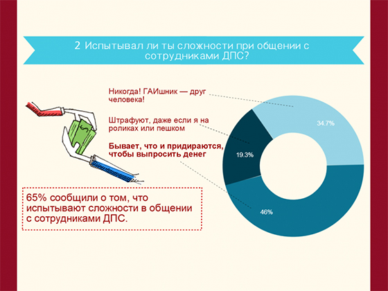 Более трети опрошенных автомобилистов (34.7%) уверены в порядочности российских инспекторов ДПС. По их мнению, они останавливают машины только при крайней необходимости и никаких взяток не берут. Правда 46% водителей думают, что инспекторы останавливают автомобилистов и сильно придираются, чтобы выпросить деньги. Если же говорить о сложностях общения с сотрудниками ДПС, то с этой проблемой столкнулись 65% респондентов.