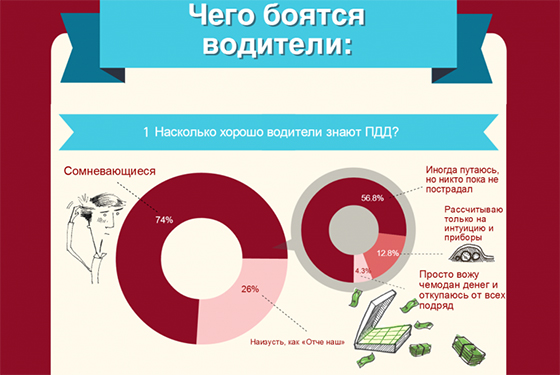 В ходе опроса выяснилось, что большинство водителей (56.8%) временами путаются в пунктах ПДД, однако от их незнания еще никто не пострадал, а вот около 13% из опрошенных признались, что на дороге полагаются исключительно на свою интуицию, в то время как 5% респондентов предпочитают восполнять пробелы в знаниях за счет кошелька.