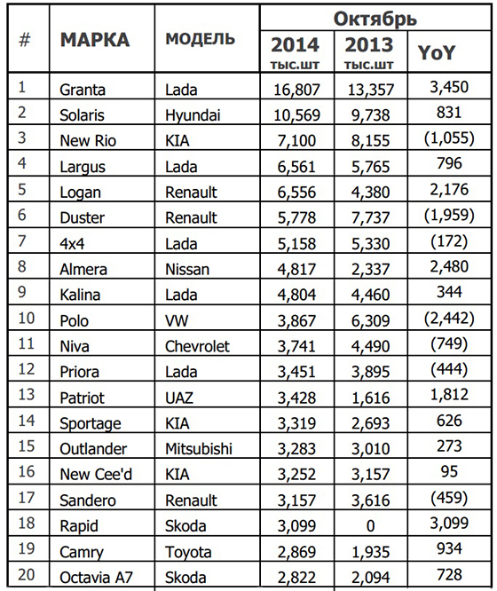 Если верить статистическим данным, то продажи легковых и коммерческих автомобилей в России в октябре 2014 года упали на 9.9%, однако некоторые модели все же продемонстрировали рост продаж. Так, самым популярным авто в стране вновь оказалась LADA Granta. За минувший месяц ее купило 16 807 покупателей, что на 3.5% лучше результатов 2013 года. Скорее всего, на динамичности продаж сказалась программа утилизации. Напомним, что спрос на «Гранту» был настолько высок, что АвтоВАЗ решил даже исключить ее из программы.