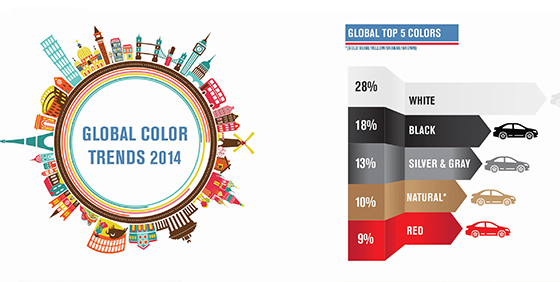 Специалисты из PPG Industies прогнозируют, что в 2015 году покупатели автомобилей отдадут предпочтение кузовам с натуральным оттенком, например, коричневым или оранжевым. Ожидается также, что спрос увеличится в новом году и на автомобили с металлическими оттенками (бронзовым, золотистым).