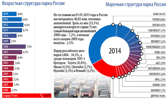 Количество зарегистрированных легковых автомобилей в России на текущий момент составило 40,85 млн. штук. Из них 33.1% - автомобили старше 15 лет. По информации агентства Автостат, самую большую долю автопарка занимают машины 2008 года (7.2%).