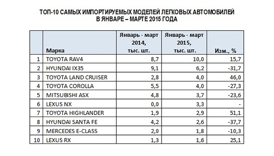 Если же говорить более детально, то лидерами среди моделей по импорту в январе-марте стала Toyota RAV4 (10 тыс. шт.), на втором месте Hyundai ix35 (6.2 тыс. шт.), а на третьем – Toyota Land Cruiser (4 тыс. шт.).
