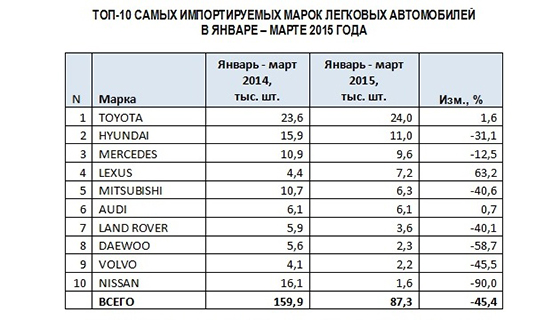 За первые три месяца 2015 года в Россию было ввезено 87.3 тысячи легковых автомобилей, что на 45.4% меньше, чем годом ранее. Предлагаем вашему вниманию ТОП-10 самых импортируемых иномарок из-за рубежа на наш рынок.