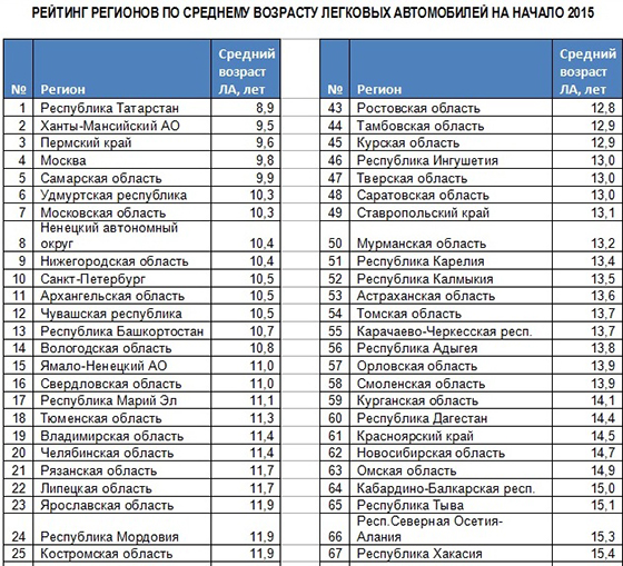В России же средний возраст легковых машин составляет 12.4 лет и только в 5 российских регионах средний возраст легковых автомобилей составляет менее 10 лет. Кроме названного Татарстана в него входит Ханты-Мансийск АО (9.5 лет), Пермский край (9.6 лет), Москва (9.8 лет) и Самарская область (9.9 лет).