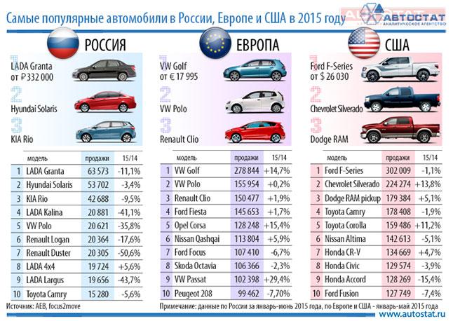 Составлен ТОП самых популярных автомобилей в России, Европе и США по состоянию на 2015 год. Так, все три авторынка отличаются друг от друга существенно. Если в Северной Америке водители предпочитают большие машины, то в европейских странах в почете компактные автомобили «В» и «С» класса.
